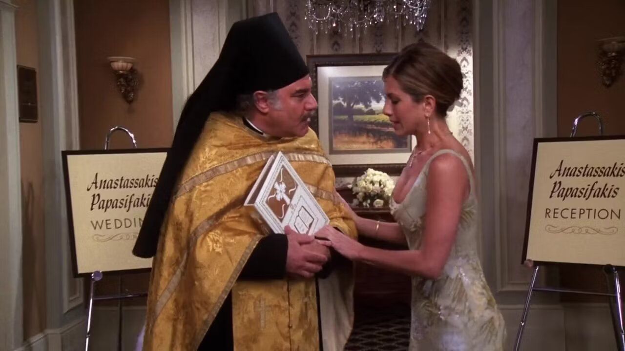 ¿Os acordáis del episodio de la boda de Mónica y Chandler, cuando Rachel le pregunta a un sacerdote griego ortodoxo si quiere unir a la pareja en matrimonio? Bueno, si os fijais en los carteles de la iglesia, sale de oficiar el enlace entre Anastassakis y Papasifakis. Pues resulta que el nombre real de John Aniston es... Yannis Anastassakis. Originalmente nació en Creta, la isla griega, pero sus padres fueron a Estados Unidos cuando él tenía dos años y se americanizaron los nombres.