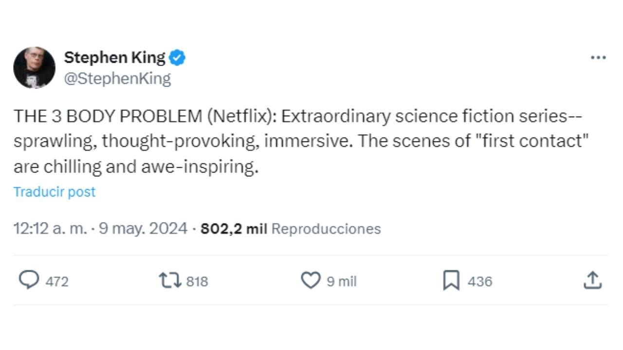 El problema de los 3 cuerpos llegó a la plataforma de 'streaming' de la gran ene el pasado mes de marzo y se convirtió en la gran ficción del mes. Creada por David Benioff y D.B. Weiss, 'showrunners' de Juego de Tronos, la serie adapta la novela homónima de Liu Cixin. King ha podido verla ya y por fin y ha dado su opinión.