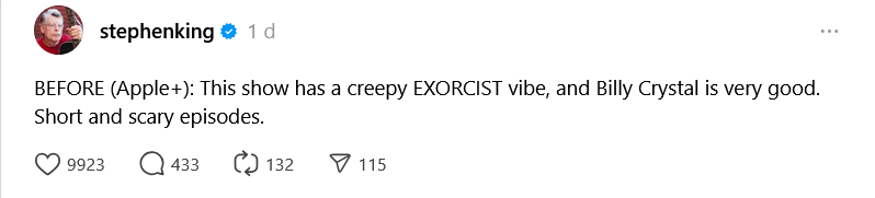 Hay que decir que Stephen King no elogia esta serie como "excelente", como sí ha hecho con otros títulos en sus ya habituales recomendaciones en sus redes sociales, pero sí reconoce abiertamente haber disfrutado bastante con la nueva miniserie Before, estrenada el pasado mes de octubre de 2024 en Apple TV+.