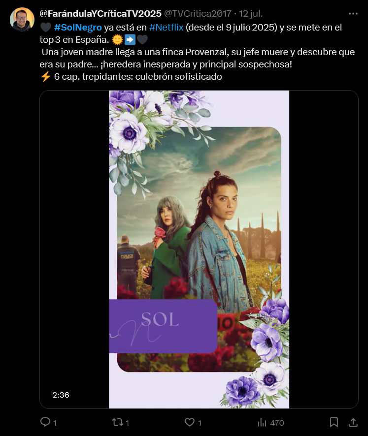 De momento, según los datos ofrecidos por FlixPatrol en el momento de escribir esta noticia, la recta final de El juego del calamar sigue liderando el top global de Netflix, pero Sol negro no deja de adelantar posiciones y ya es número 1 en 28 países. En España, no obstante, se tiene que conformar con el segundo, puesto que los suscriptores españoles se han rendido a los pies del thriller Ángela protagonizado por Verónica Sánchez.