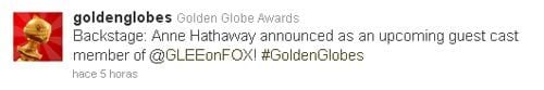 La 68 edición de los Globos de Oro nos ha dado una lista de ganadores en la categoría de televisión, pero también nos ha regalado un cameo. La dirección de Twitter de los galardones ha publicado que la actriz Anne Hathaway ('Amor y otras drogas', 'El diablo viste de Prada') participará como invitada en un capítulo de 'Glee'. De momento no se sabe nada del papel, aunque la intérprete ya había confesado que le gustaría hacer de familia de Kurt, el reciente ganador de un Globo de Oro Chris Colfer.