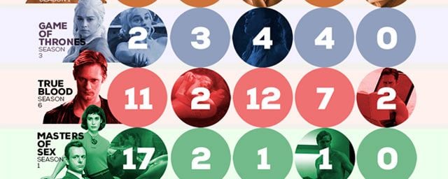 ¿Girls, Juego de Tronos, Masters of Sex, True Blood u Orange is The New Black? Te daremos una pista: No es Juego de Tronos. Tras las numerosas críticas que condenaban el exceso de desnudos innecesarios en la adaptación televisiva de Canción de hielo y fuego, parece que, sea uno sea uno de sus "pecados", no es uno de los elementos que destaque respecto a otras series. De hecho, la exitosa ficción es la última de la lista en número de escenas subiditas de tono. ¿La ganadora? La también serie de HBO True Blood. Y por goleada.