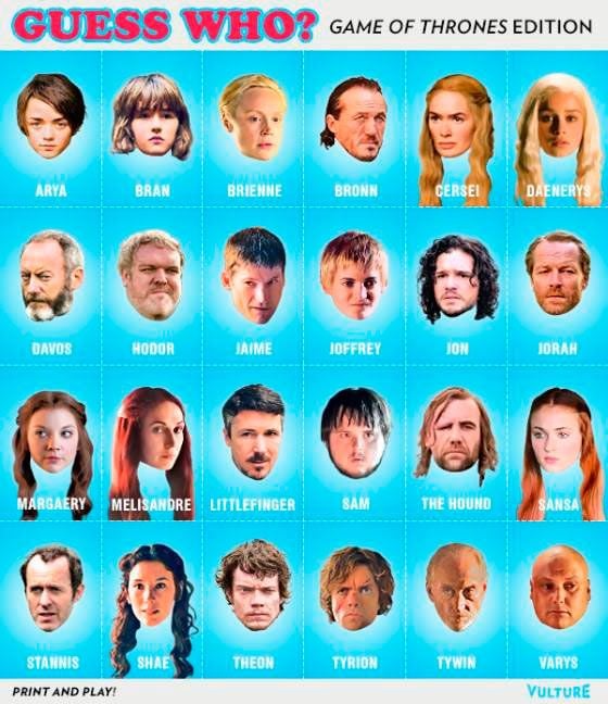 Mientras la cuarta temporada de Juego de Tronos continúa arrasando en HBO, 'Vulture' se ha sumado a la moda de montajes, parodias, 'mash-ups' y un largo etcétera que parece no tener fin en la red y ha diseñado un divertido juego que promete sacarte una sonrisa: El '¿Quién es quién?' de Poniente. Como recordarás, el popular juego que ha entretenido durante décadas a distintas generaciones consiste en averiguar el personaje de tu contrincante a través de preguntas sobre su aspecto... ¿Te imaginas hacerlo con los habitantes de los Siete Reinos?