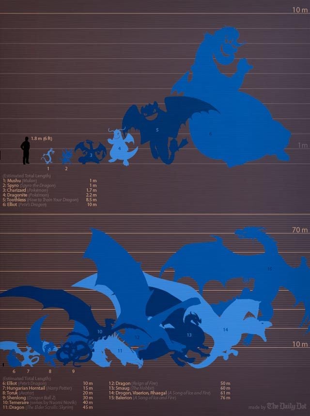 ¿Sabías que Balerion, uno de los famosos dragones de Aegon el Conquistador en la serie de novelas Canción de hielo y fuego, es aún más grande que Smaug, la famosa criatura de El Hobbit? Así lo muestran las excelentes infografías diseñadas por 'GB Posters Blog' y 'The Daily Dot', que comparan en tamaño a algunos de los dragones más famosos del cine, la televisión, la literatura y los videojuegos.