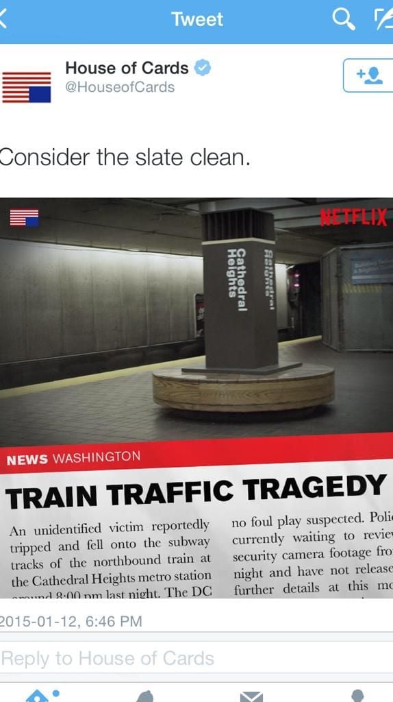En el tuit se recordaba el comienzo de la segunda temporada, en el que Frank Underwood (Kevin Spacey) empuja a la periodista Zoe Barnes (Kate Mara) al pasar el tren, acabando así con su vida. El tuit decía "Considere la estación limpia" acompañado de una imagen con un falso titular que comunicaba “Tragedia de tránsito en el tren”.