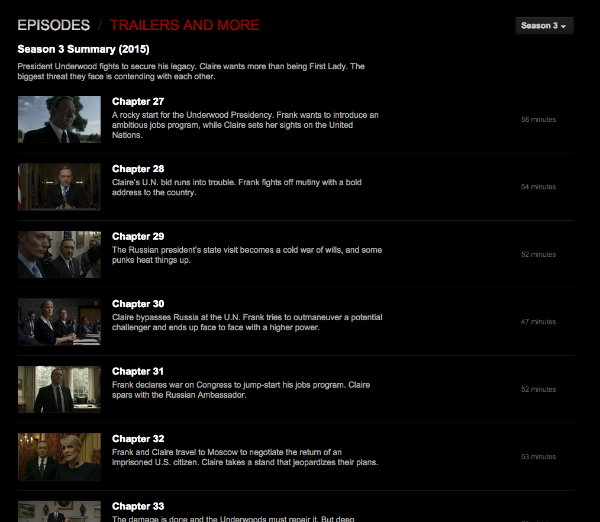 “Esto es Washington. Siempre hay una fuga. Los 13 episodios se lanzarán el día 27 de febrero”, dice el tuit. Por su parte, Netflix añadió en boca de un representante: “Debido a un problema técnico algunos fans de Frank Underwood han conseguido un adelanto”. Sin embargo, este fallo supuso que los capítulos que ya tenían cargados los usuarios pudiesen verse en streaming, de modo que unos cuantos afortunados ya conocen las andanzas del Presidente Underwood y la primera dama.