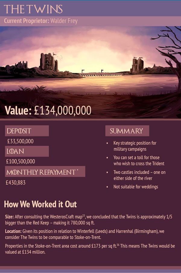 ¿Alguna vez has pensado vivir en Invernalia? ¿O en El Muro? La inmobiliaria London & Country Mortgages ha calculado lo que podría costarte. Anterior1 - 12 - 23 - 34 - 45 - 56 - 67 - 7Siguiente Si lo que buscas es vivir en un punto estratégico, Los Gemelos es tu casa. No adecuado para bodas.