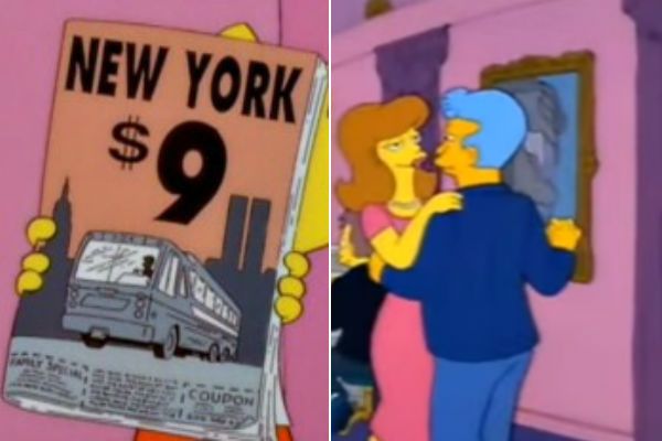 En "La ciudad de Nueva York contra Homer Simpson" -emitido por primera vez en el año 1997-, la familia viaja a la Gran Manzana. Antes de emprender su viaje, se puede ver un folleto que promociona viajes de autobús a la ciudad. En la portada aparece la silueta de las torres gemelas -que se asemejan al número 11- y el precio del billete: 9 dólares. Tal y como están dispuestos en el dibujo, aparece la fecha de los atentados al estilo americano: 9/11.