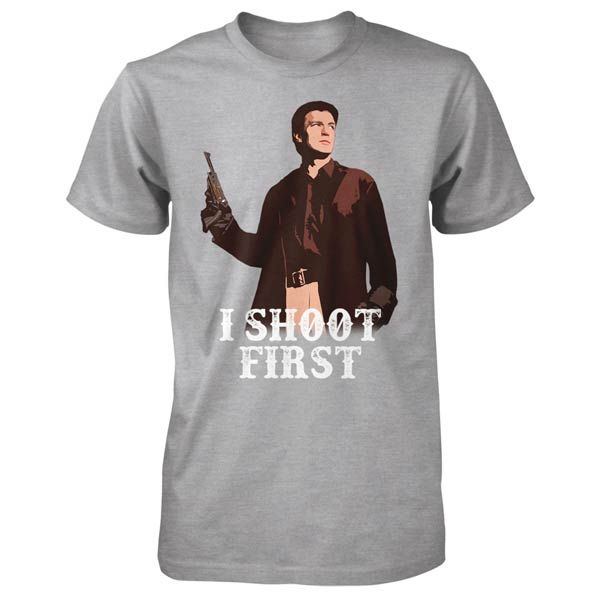 En ella, el capitán de Serenity aparece sobre la frase "I shoot first" (Yo disparé primero), un guiño a la usada por los fans de Star Wars en referencia a la escena protagonizada por Han y Greedo en el Episodio IV de la saga.