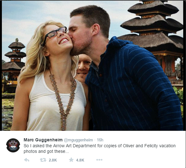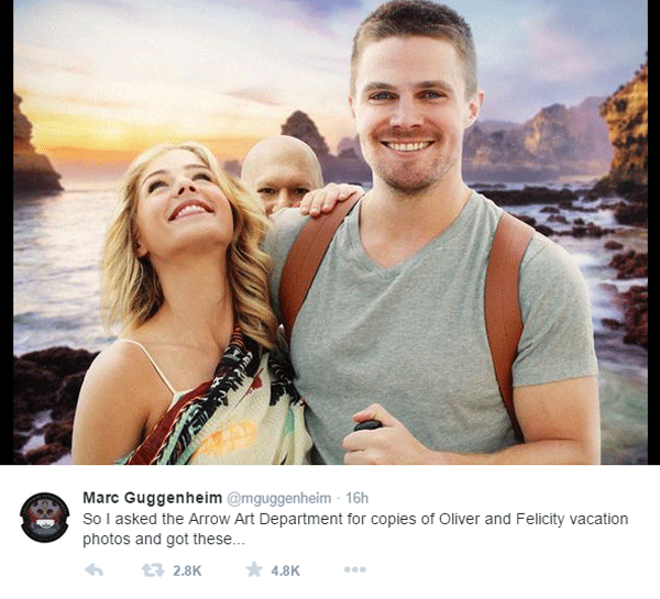 El próximo 7 de octubre regresa a las pantallas de televisión Arrow con su cuarta temporada. Esta nueva tanda de episodios continuará a partir del final de la temporada anterior en la que Felicity Smoack (Emily Bett Rickards) y Oliver Queen (Stephen Amell) se toman unas merecidas vacaciones de Starling City. Ahora el productor ejecutivo, Marc Guggeneheim, ha decidido mostrar algunas de las imágenes de esas vacaciones, pero con algunas modificaciones.