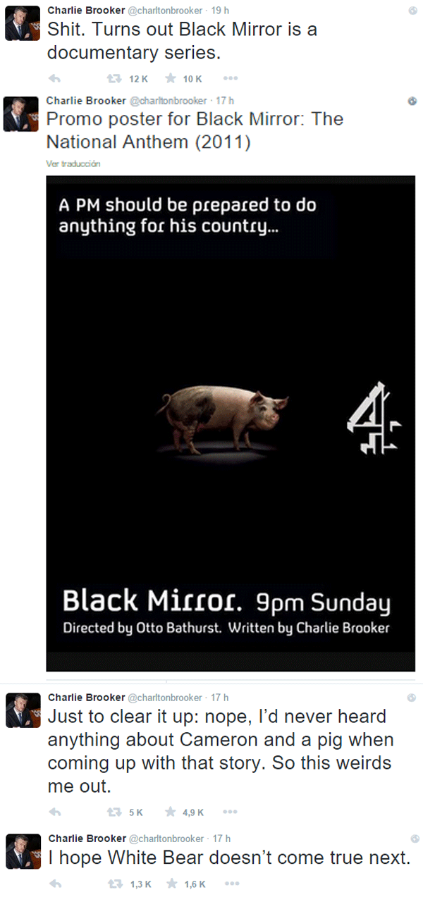 Este conocido capítulo ha sido muy recordado este fin de semana con motivo del llamado 'pig gate'. Y es que, un libro recién publicado afirma que el primer ministro David Cameron introdujo sus genitales en la boda de un cerdo muerto como parte de un ritual de iniciación en la Universidad de Oxford. Muchos son los que han comparado este incidente con el episodio de Black Mirror, incluido el creador de la ficción, Charlie Brooker.
