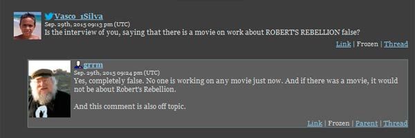 "Completamente falsa. Nadie está trabajando en ninguna película ahora mismo. Y si hubiese una película, no sería sobre la Rebelión de Robert".