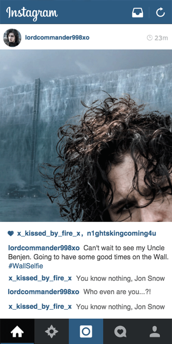 La cuenta lordcommander998xo pretende descubrir cómo se comportaría el conocido personaje de la ficción de HBO. Anterior1 - Intro2 - 13 - 24 - 35 - 46 - 57 - 68 - 79 - 8Siguiente 2. "No puedo esperar a conocer a mi tio Benjen. Me esperan buenos momentos en el Muro. #MuroSelfie"