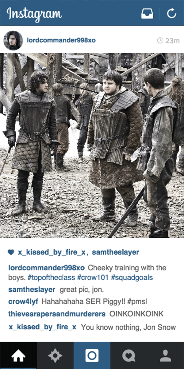 La cuenta lordcommander998xo pretende descubrir cómo se comportaría el conocido personaje de la ficción de HBO. Anterior1 - Intro2 - 13 - 24 - 35 - 46 - 57 - 68 - 79 - 8Siguiente 3. "Entrenamiento descarado con los chicos #ElPrimeroDeLaClase #Equipo101 #MetasDelEscuadrón"