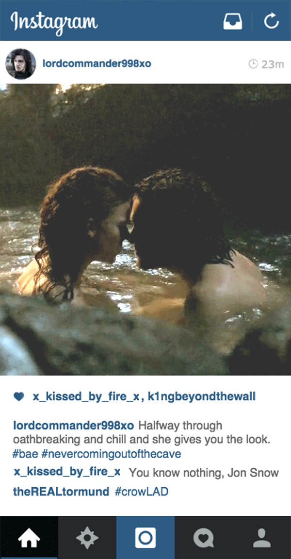 La cuenta lordcommander998xo pretende descubrir cómo se comportaría el conocido personaje de la ficción de HBO. Anterior1 - Intro2 - 13 - 24 - 35 - 46 - 57 - 68 - 79 - 8Siguiente 5. "A medio camino de romper el código de y sentir escalofríos y ella te da la mirada. #Bae #NuncaVoyaAAbandonarEstaCueva"