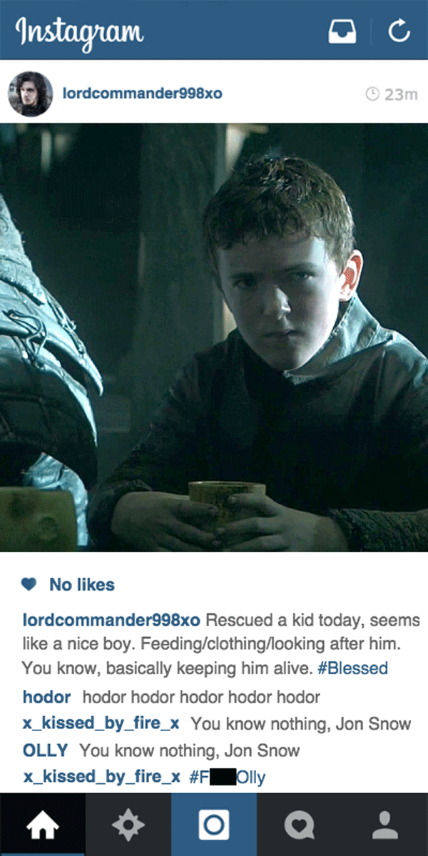 La cuenta lordcommander998xo pretende descubrir cómo se comportaría el conocido personaje de la ficción de HBO. Anterior1 - Intro2 - 13 - 24 - 35 - 46 - 57 - 68 - 79 - 8Siguiente 7. "He rescatado a un niño hoy. Parece un buen chico. Alimentarle/vestirle/cuidarle. Ya sabes, básicamente mantenerle con vida. #Bendecido"