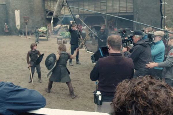 1. ¡Los 'flashbacks' han llegado! En esta imagen se puede ver a dos jóvenes entrenando con dos espadas de madera en lo que parece ser Invernalia. Y sí, ese es Ned Stark, luchando con el que parece ser su hermano mayor, Brandon Stark. Las dos pistas que indican que se trata de un 'flashback' son que Invernalia está intacta, y dos, que hay un símbolo de un lobo a en la parte izquierda de la imagen.