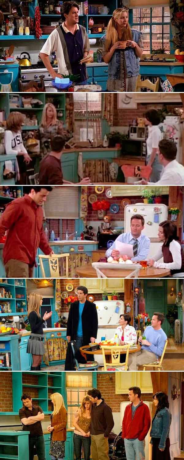 Cuando comenzó la serie, las vistas desde la casa de Rachel y Mónica eran un edificio más o menos lejano y varios tejados de Nueva York, luego cambia a una ventana muy cercana a su propio edificio, más tarde éste desaparece y sólo se ve un muro de ladrillos rojos y hacia el final de la serie simplemente se ve la oscuridad. En el último capítulo vuelve a aparecer una ventana, aunque no es la misma que la que se veía al principio. En estas imágenes se puede ver el cambio que se produce en segundo plano.