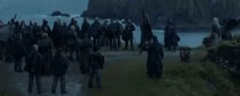 En el tráiler se puede ver cómo varias personas están reunidas ante lo que parece ser un sacrificio. Gracias a las banderas que ondan, podemos confirmar que se tratan de los Greyjoy y si nos fijamos más detenidamente, vemos que el posible sacrificio tiene un parecido razonable a Daenerys Targaryen.