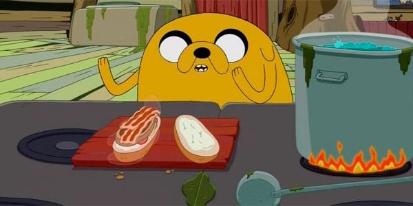 A todos nos sentaría un poco mal que alguien nos robase el sándwich que tanto tiempo nos había llevado hacer justo cuando íbamos a hincarle el diente. Los ingredientes que lleva el mejor sándwich de todos los tiempos -según Jake- son los siguientes: romero, mayonesa, pepinos de su amigo Prism-o, algo de tomillo, huevos, el pájaro de la ventana, rebanadas de tomate, cebolla, tocino, lágrimas para la sal, el alma de langosta y carne preparada.