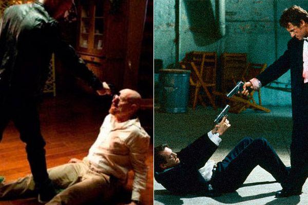 Hank agarra a White de la misma manera que Corleone a Fredo y le dice "Fuiste tú. Todo tiempo eras tú", las mismas palabras que en El Padrino. En otra escena, Jesse y Walt comen en un restaurante llamado Denny's, el mismo que quería usar Tarantino en Pulp Fiction. Según el podcast Breaking Bad Insider, esto es una referencia al mítico filme. También hay un pequeño homenaje a Reservoir Dogs, Jesse Pinkman sería Señor Rosa y Walter White, Señor Blanco. La escena que se ve arriba es casi una copia exacta de un fotograma del filme de Tarantino.