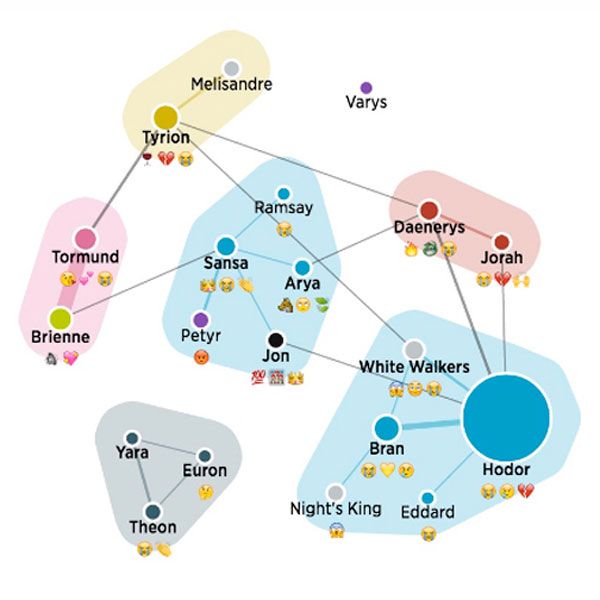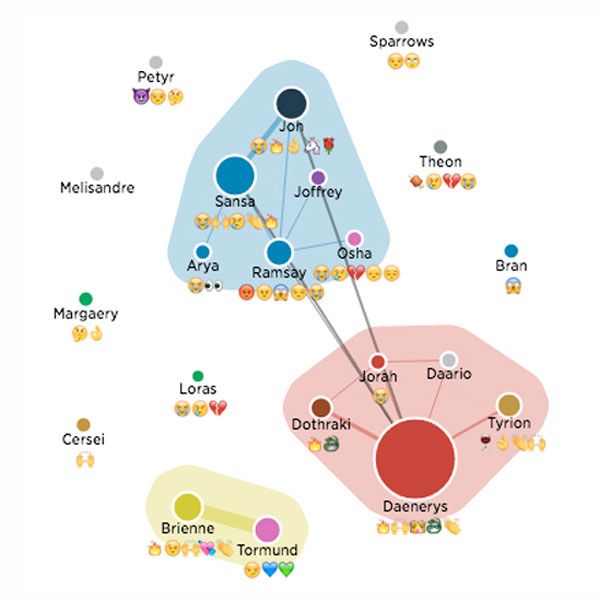 De igual manera, en el último episodio 'Book of The Stranger' (6x06), Daenerys es el centro de una de las secuencias más impactantes, generando una inmensa cantidad de tweets y ocupando por ello un lugar importante en el mapa. Este episodio sirve también para ver cómo Twitter no solo analiza los nombres de los personajes, ya que también recoge los emojis más usados que se asocian a cada uno. Esta es la razón por la que, de acuerdo con el mapa, Brienne y Tormund están unidos, acompañados por emojis de corazones.