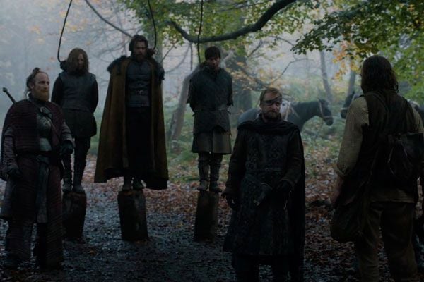 Así, Clegane halla a los asesinos siendo sentenciados a muerte por Beric Dondarrion, líder de la Hermandad. Lejos de optar por la violencia ("No me obligues a matarte de nuevo, Dondarrion"), ambos negocian los términos de la venganza del Perro y, finalmente, Dondarrion le ofrece unirse a la Hermandad. Si bien, la respuesta del Perro no es una positiva tampoco se opone a la idea.