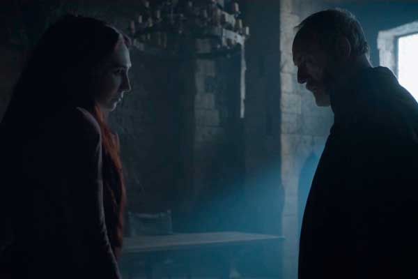 En el episodio anterior, Davos encontró una pequeña figura de madera que le pertenecía a Shireen Baratheon, la hija de Stannis, en medio de los restos de una hoguera. Con la certeza de que la niña había sido quemada por los consejos de Melisandre, el Caballero de la Cebolla, confronta a la bruja delante de Jon, quien decide perdonarle la vida si abandona Invernalia y se dirige hacia el sur para no volver.