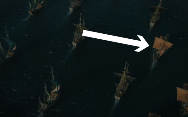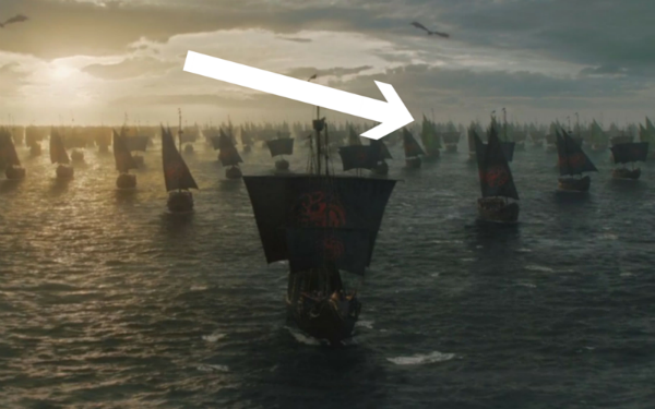 En el momento final del episodio, cuando Daenerys y sus aliados comienzan su travesía hacia Poniente, junto a los barcos con el escudo de armas de los Targaryen, también se pueden ver otros con los símbolos de los Tyrell y los Martell. Esto complementa el que ambas casas apoyen a la Madre de Dragones y explica la forma de transporte de Varys.