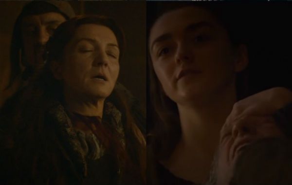 La venganza de Arya ha comenzado. La joven Stark ha matado a sangre fría a Walder Frey, organizador de la Boda Roja en la que murieron su hermano Robb y su madre Catelyn -además de la esposa de este y su hijo nonato-. Esta imagen recuerda mucho a la muerte de su madre, los responsables de la serie han querido que ambas muertes estén relacionadas para así darle un nuevo significado.