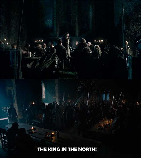 En los dos episodios de Juego de Tronos se proclama un Rey del Norte, en la primera a Robb Stark y en la sexta a Jon Nieve: