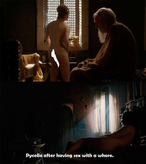 Una escena de Pycelle después de tener sexo con una prostituta aparece en los dos finales de la primera y sexta temporada: