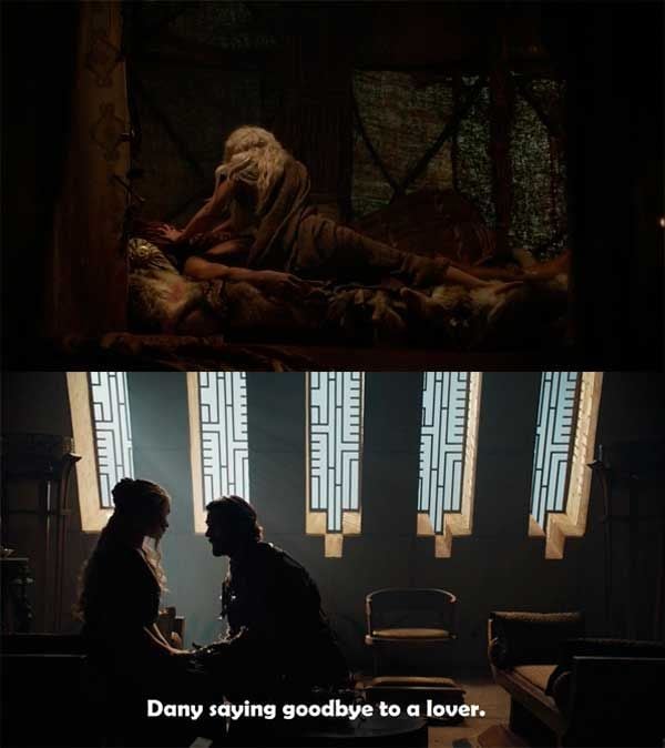 En los dos capítulos aparece también Daenerys diciendo adiós a un amante, aunque Daario tuvo un mejor destino que Khal Drogo: