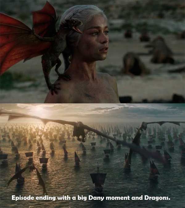 Y por último, el final de los dos episodios acaban con un gran momento protagonizado por Daenerys y sus dragones: