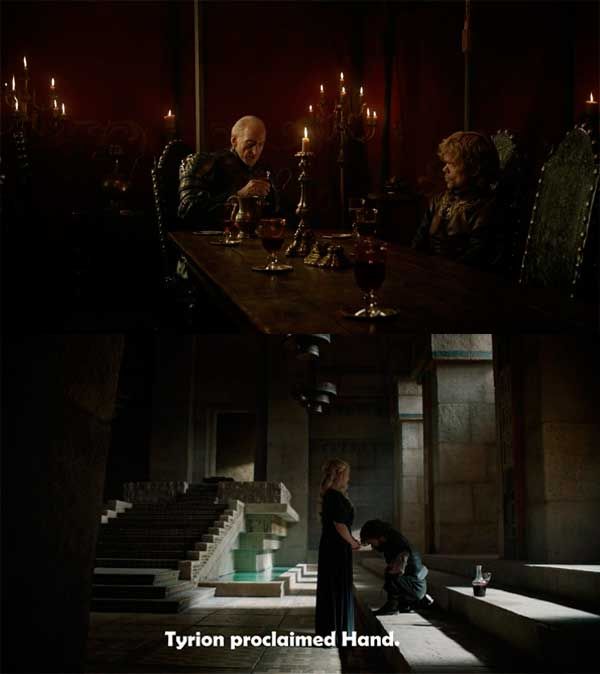 Tyrion es proclamado Mano de sus respectivos reyes de la primera y sexta temporada, aunque se lo tomó mejor cuando se lo ha proclamado la propia Daenerys: