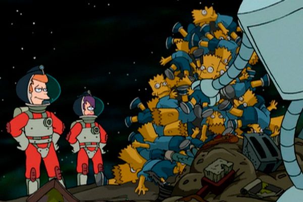 Ya sabemos que Fry era fan de Los Simpson -a juzgar por la cabeza que guarda en el sótano-, por eso no es de extrañar que reconozca al instante una pila de muñecos de Bart Simpson que aparece en el episodio 'Un montón de basura'. En la escena, Bender comienza a comerse los pantalones de los muñecos algenado que ellos se lo habían pedido.