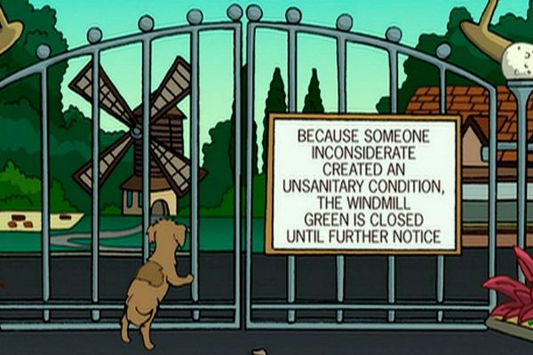 ¿Recuerdas el capítulo de Los Simpson titulado 'Margie, ¿puedo acostarme con el peligro?', en el que Homer y Marge intentaban recuperar el romanticismo en su matrimonio y terminaban desnudos en el molino del parque de minigolf? Uno de los episodios más recordados de Futurama, 'Ladrido jurásico', incluye una de las referencias más inteligentes de la serie. Cuando Seymour está buscando a Fry, llega al parque de minigolf y encuentra un cartel que advierte de que el molino está cerrado porque "alguien desconsiderado creó una situación poco higiénica". ¿Te suena de algo?