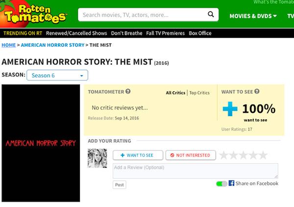Según informa The Wrap, Rotten Tomatoes podría haber revelado accidentalmente la trama de la sexta temporada de la exitosa serie de FX en su página donde aparecía que se titularía American Horror Story: The Mist. Puedes ver la imagen a continuación: