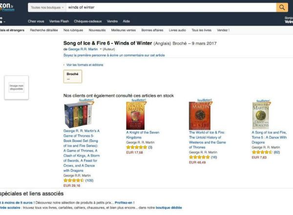 Pero antes de que eso suceda, todo apunta a que la sexta novela de la saga Canción de hielo y fuego, Vientos de invierno, llegará a las librerías. Recientemente, saltó la noticia de que la editorial Penguin le había dado un número ISBN y la había añadido a la lista, lo que hacia sospechar que su publicación sería próxima. Y este martes, Digital Spy publica que en Amazon Francia ya aparece la fecha de estreno exacta para esta esperada novela, el 9 de marzo de 2017.