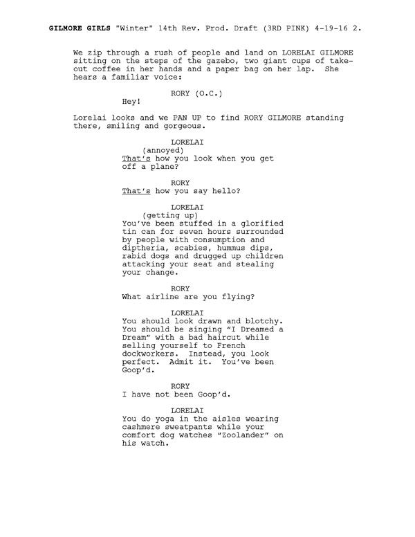 Lorelai Gilmore está sentada en el gazebo de Stars Hollow con dos tazas gigantes de café y una bolsa de papel en su regazo. De repente, escucha una voz familiar: RORY- ¡Hola! LORELAI- ¿Así es como te ves cuando bajas de un avión? RORY- ¿Así es como dices hola? LORELAI- Has estado encerrada en un glorioso tarro durante siete horas rodeada de gente con tisis, difteria, sarna, perros rabiosos y niños drogados atacando tu sitio y robando tu cambio. RORY- ¿Con qué aerolínea vuelas? LORELAI- Deberías estar demacrada y manchada. Deberías estar cantando 'I Dreamed a Dream' con un horrible corte de pelo mientras te vendes a obreros franceses. En lugar, estás perfecta. Admítelo. Estás colocada. RORY- No he estado colocada LORELAI- Haces yoga en los pasillos llevando pantalones de chándal de cashemere mientras tu perro mira Zoolander en su reloj.