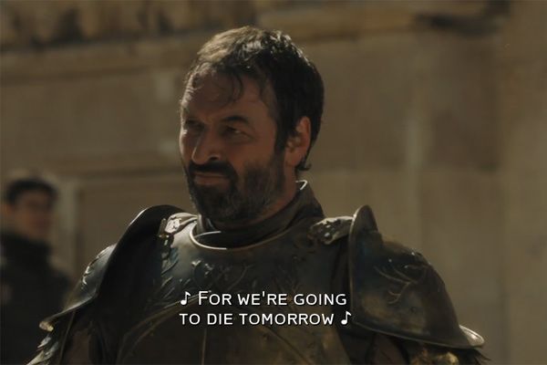 Cuando Meryn Trant llega a Braavos en la quinta temporada, Mace Tyrell canta "para los que vamos a morir mañana". En capítulo final de esa entrega, muere Meryn Trant a manos de Arya pero también Myrcella, Selyse Florent, Stannis Baratheon y Jon Nieve.