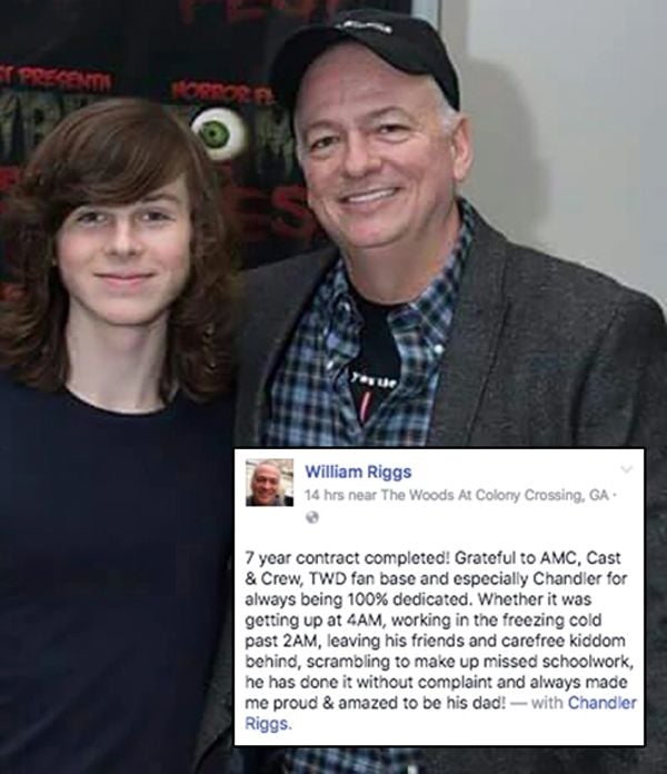 "¡7 años de contrato terminados! Agradecido a AMC, al elenco y al equipo, a los fans de TWD y especialmente a Chandler por siempre dedicarse al 100%. No importa si tenía que levantarse a las 4 de la mañana, trabajar bajo el frío congelador pasadas las 2 de la mañana, dejar a sus amigos y una adolescencia normal y libre, luchando por recuperar los deberes pasados, él ha hecho todo sin quejarse y siempre ha conseguido que me sienta orgulloso y maravillado de ser su padre".