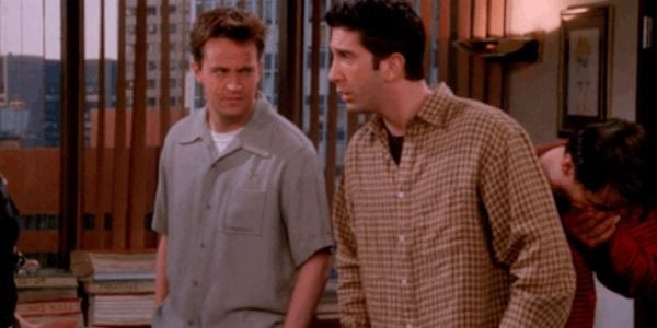 En el episodio 22 de la cuarta temporada, 'El del peor padrino del mundo', se ve claramente cómo Joey se esconde detrás de Ross y Chandler para ocultar su ataque de risa. Con el formato original, no se hubiese visto, pero ahora aparece en pantalla, ¡y es imposible no mirarlo!