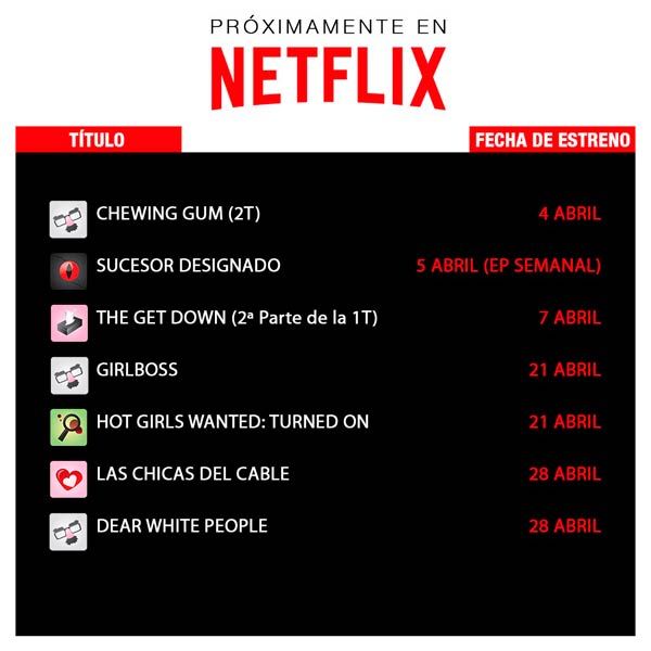 Sin embargo, el estreno de Las Chicas del Cable no tendrá lugar a finales de mes, concretamente el 28 de abril, aunque antes de esa fecha los suscriptores podrán disfrutar del estreno de otras series originales de la plataforma: el primero de ellos, la segunda parte de la primera temporada de la ritmosa The Get Down ambientada en el Bronx, que verá la luz el día 7. Completan la lista de originales Girlboss (21/04), Bill Nye Saves he World (21/04) y Dear White People (28/04), mientras que también serán estrenadas en exclusiva a través de Netflix en España la segunda temporda de la británica Chewing Gum (4/04) y Sucesor Designado, la nueva serie de Kiefer Sutherland que verá la luz tan sólo un día después de su estreno al otro lado del charco.