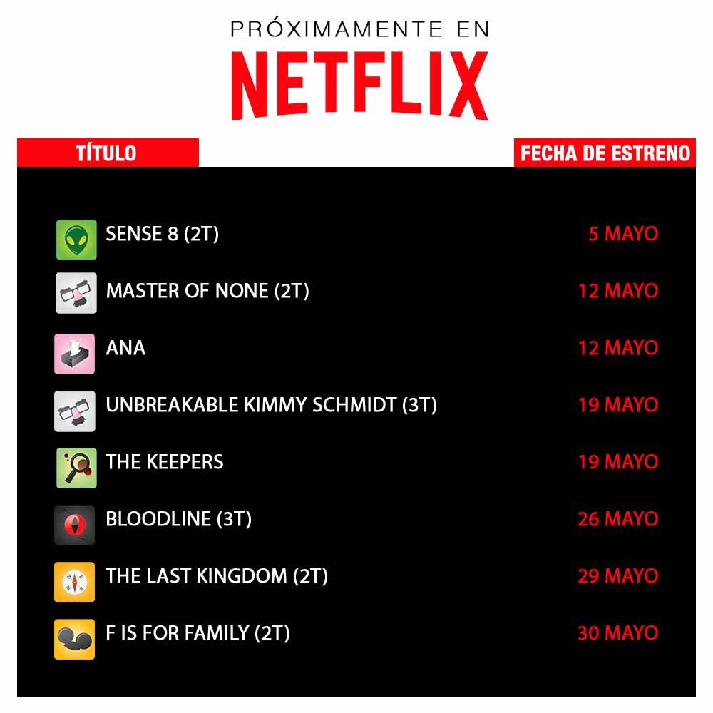 Inaugura el mes de mayo de 2017 la segunda temporada de Sense8, el drama de ciencia ficción desarrollada por Lily y Lana Wachowsky para la plataforma, que continuará contando la historia de los sensates y cuyos 10 episodios se pondrán a disposición de los usuarios de Netflix el próximo 5 de mayo. Otros de los regresos más esperados son los estrenos de la segunda temporada de la serie creada y protagonizada por Aziz Ansari Master of None; la tercera temporada de la hilarante comedia Unbreakable Kimmy Schmidt; la tercera temporada de Bloodline, y la segunda de la ficción animada F is for Family.