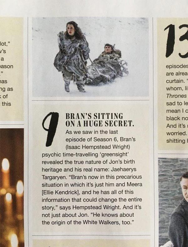 Para añadir más datos a esta ecuación, el último número de Empire -recogido en Reddit- contiene información sobre la siguiente temporada, una información que hasta ahora era desconocida. Y es que en este artículo se explica que Bran es el único conocedor del verdadero origen de Jon, ya que lo vio en una visión gracias a sus poderes psíquicos, y afirma que el verdadero nombre del personaje es Jaehaerys Targaryen.