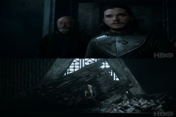 El Rey en el Norte camina hacia la fortaleza Targaryen acompañado de Davos y algunos soldados de la casa Stark. Además, Missandei, la consejera de la Madre de Dragones, parece acompañarles por el largo sendero. Las puertas se abren y ante un Jon Nieve visiblemente sorprendido, Daenerys Targaryen le espera sentada en su trono.