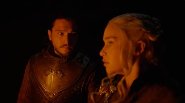Jon y Daenerys descubren los secretos de la cueva: En el tercer episodio, Daenerys permitía que Jon y sus hombres entrasen en la cueva de Rocadragón en busca del vidriagón, el único material capaz de derrotar al Rey de la Noche y su ejército de Caminantes Blancos. En 'Botines de guerra', ambos entran a la cueva para descubrir que los Primeros Hombres y los Niños del Bosque la habitaron hace miles de años, durante su lucha unidos contra los Caminantes. En ese momento, la Madre de Dragones ve el primer dibujo de cómo son los enemigos del Norte y decide ayudar a Jon con todo lo que posee, siempre que se arrodille ante ella.