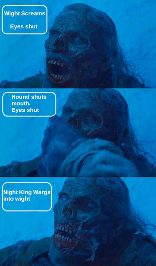 2) El Rey de la Noche controla al espectro capturado con su habilidad de warg. En un momento concreto mientras es capturado, los ojos del espectro se vuelven azules de repente sugiriendo que ha sido poseído. ¿Por el Rey de la Noche? De ser así, el Rey de la Noche habría espiado cada movimiento y conversación del grupo y ajustarse a sus planes. Puedes verlo en esta imagen publicada primero en Reddit a continuación: