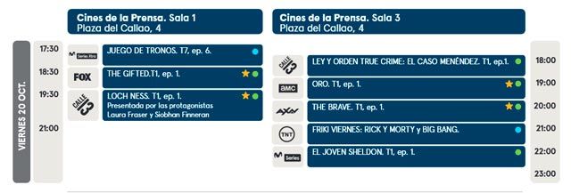 Los Cines de la Prensa también serán el escenario de preestrenos mundiales como S.W.A.T. Los hombres de Harrelson (AXN) o la segunda temporada de Modus (Calle 13), y tanto de la proyección de las nuevas grandes apuestas de las cadenas como de grandes series ya consolidadas como Juego de Tronos o American Horror Story.